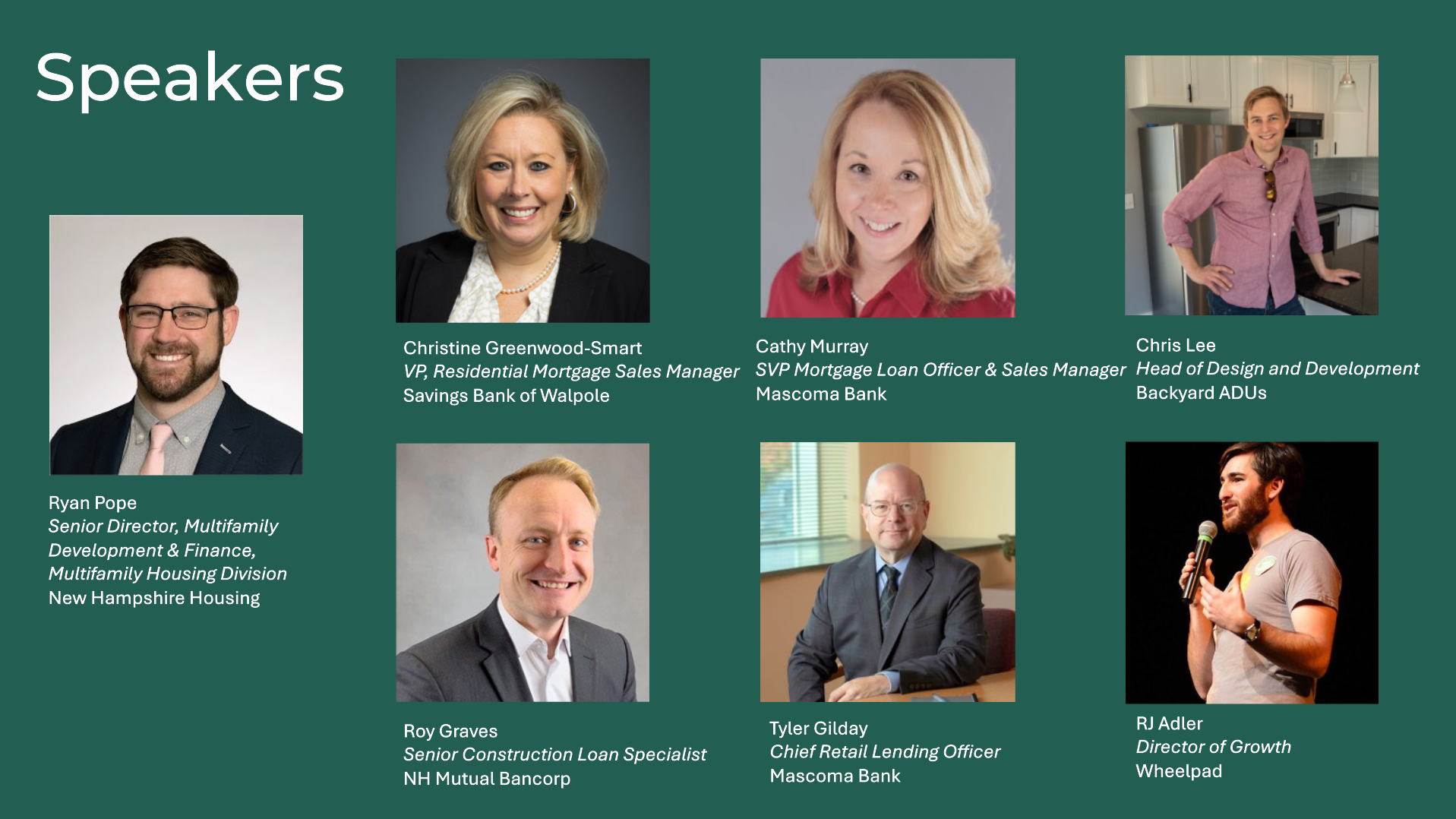 Several lending institutions, builders, and housing experts came together on Tuesday, December 2, 2025 to discuss options for homeowners looking to finance an ADU. Guest speakers included Christine Greenwood-Smart from Savings Bank of Walpole, Roy Graves from NH Mutual Bancorp, Cathy Murray from Mascoma Bank, Chris Lee from Backyard ADUs, RJ Adler from Wheelpad, and Ryan Pope from NH Housing.